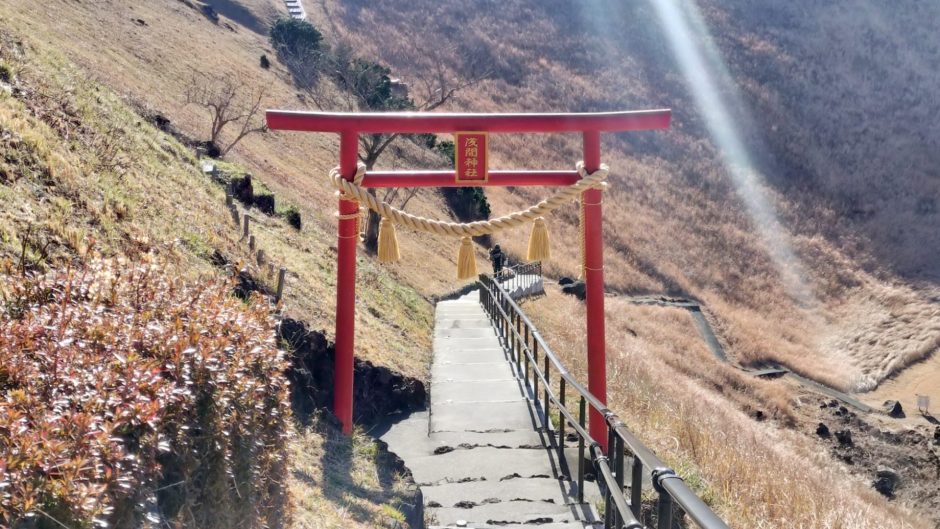 リフト乗り場から火口に向かっておりて行くと鳥居があります